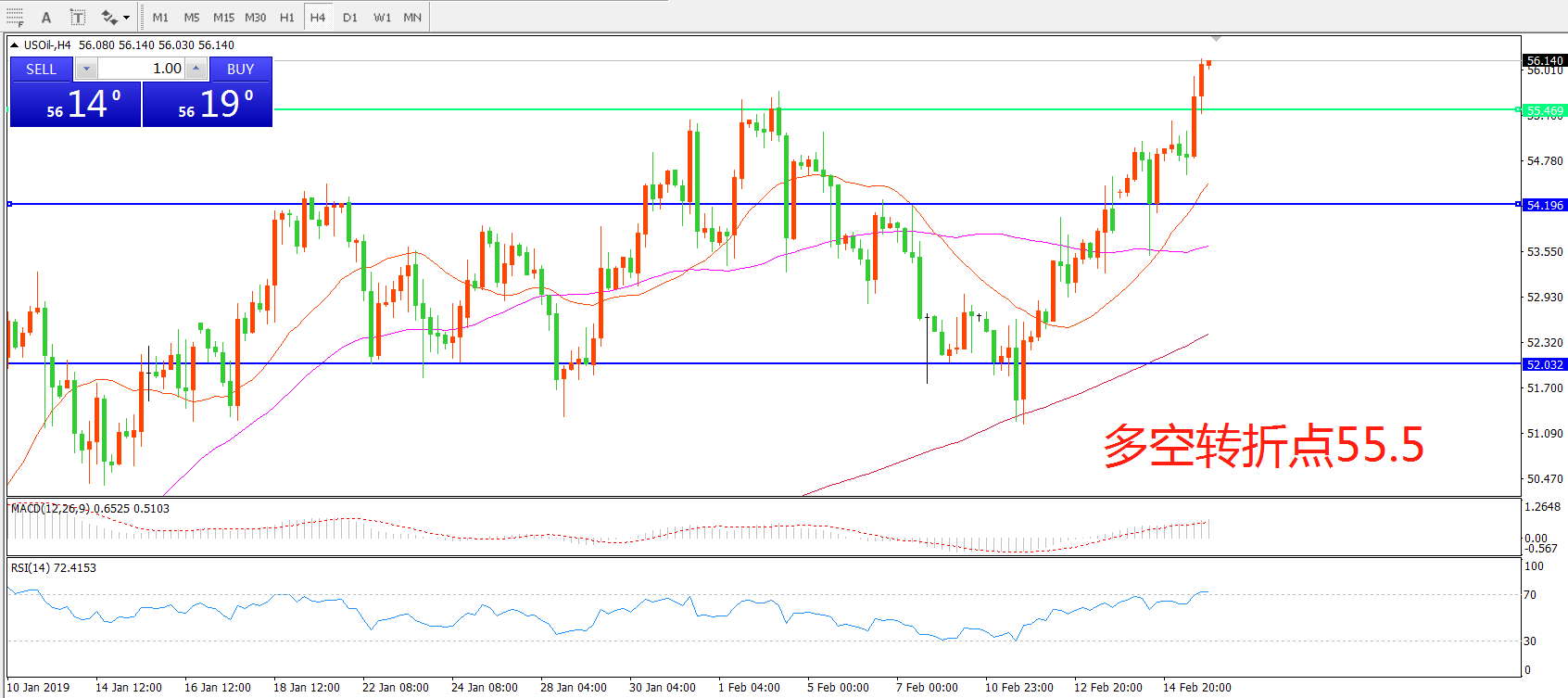 2月15日周五,随着中美本轮谈判结束,市场紧张情绪有所缓解,WTI原油上涨超过2%,报54.96美元,本周上涨5.58%。虽然美国石油活跃钻井数再度增长3座,但减产行动带来的乐观情绪以及中美贸易谈判释放积极信号均为油价提供强劲支撑,同时美元承压回落也有助于油价进一步走高。
