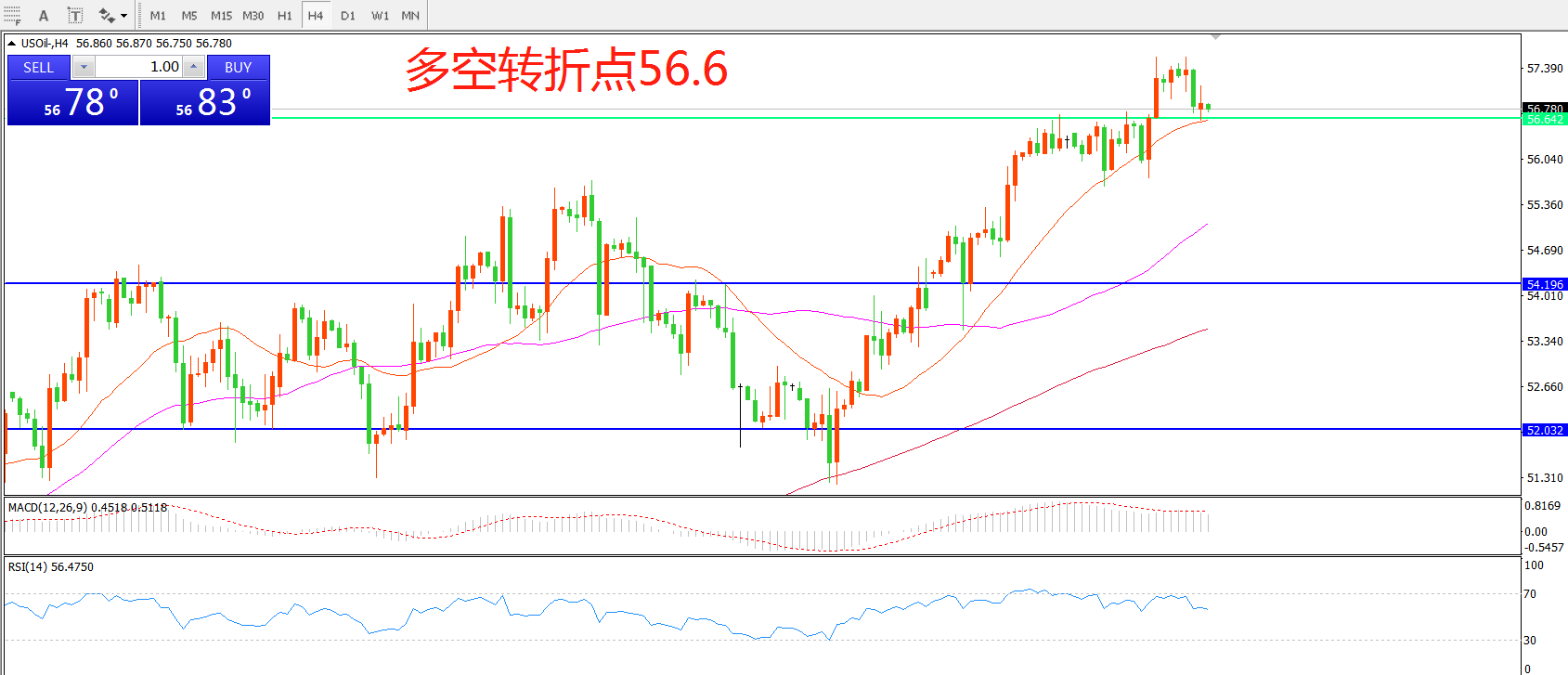 4小时图看,油价呈现冲高回落形态,目前险守于21均线附近。短线思路仍然偏多,MACD红柱走平,重点关注56.6一线支撑。