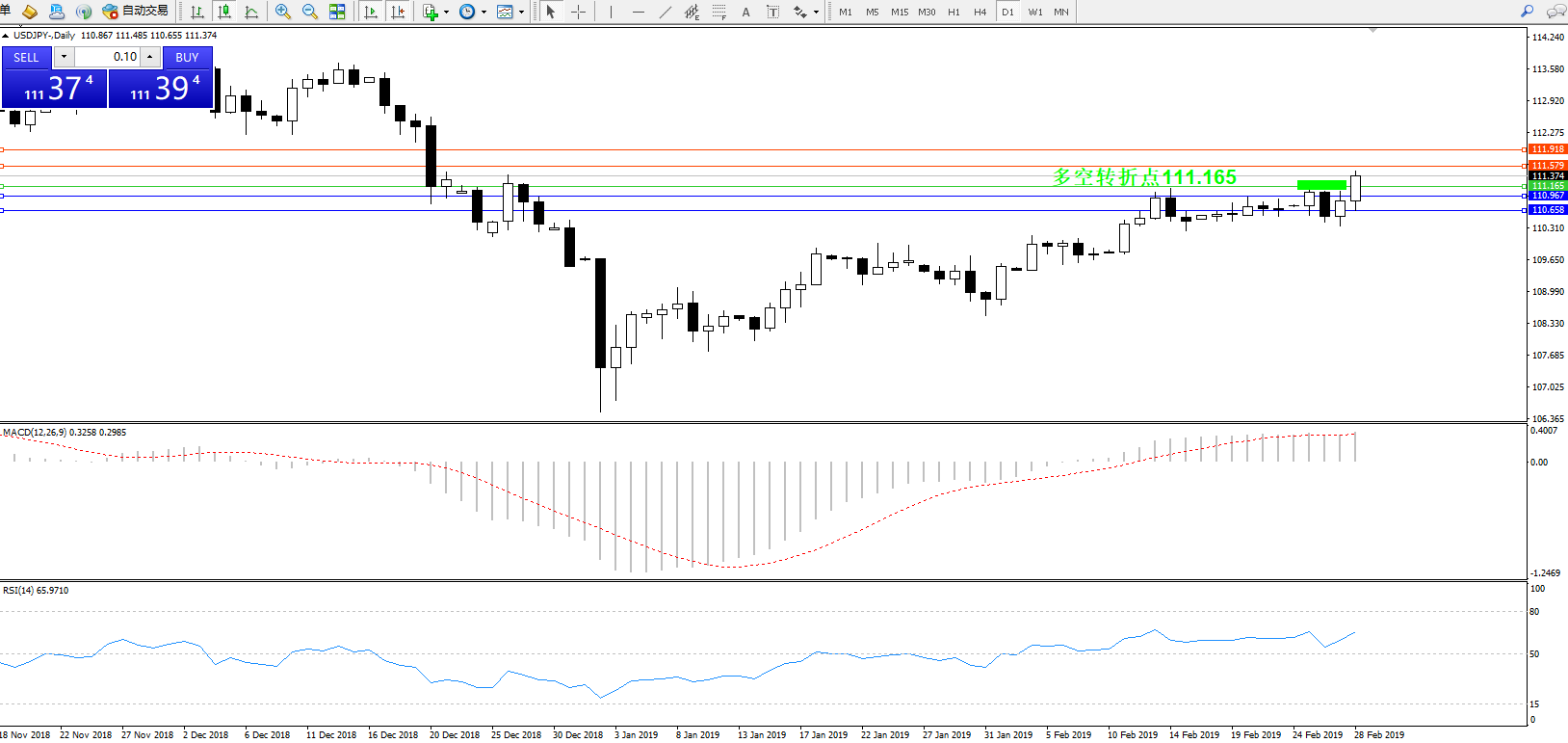 美元兑日圆升至10周高位,美国四季度GDP回落至2.6%,全年增速跌破3%但创2015年来最高,美国经济第四季成长强於预期。GDP报告不会改变美国联邦储备理事会(FED/美联储)的政策轨迹。美国总统唐纳德·J·特朗普与朝鲜民主主义人民共和国国务委员会委员长金正恩于2019年2月27日至28日,在越南河内展开了良好和具有建设性的会谈。双方领导人讨论了推进无核化的多种途径与经济驱动的概念。投资者也在关注印度和巴基斯坦之间的紧张局势。加上美国总统特朗普的前私人律师科恩今天的证词,可能会加剧股市波动,带来避险买盘,尽管这可能是短暂的 。另外中美贸易谈判仍然存在很多变数,料不会太顺利,这对全球经济正在形成负面影响。