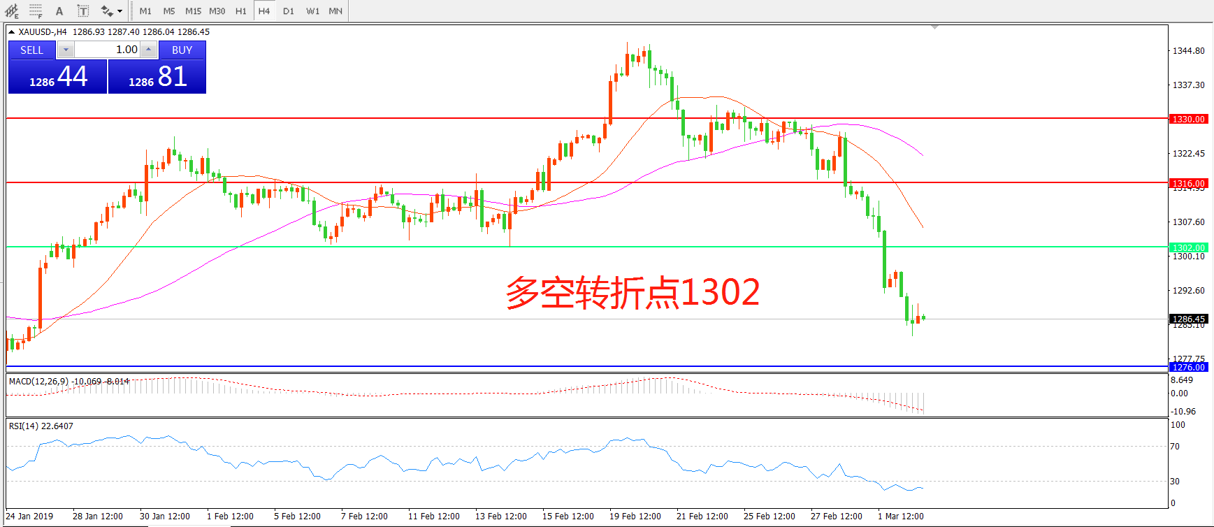 4小时图看,金价跌破1302撑后连续下行,整体走势偏空。MACD绿柱增加,RSI指标掉头向下,日内延续下行概率较大。