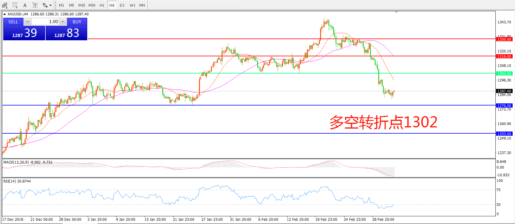 4小时图看,金价跌破1302撑后连续下行,整体走势偏空,但短线已经出现盘整筑底迹象。MACD绿柱增加,RSI指标掉头向下,日内延续下行概率较大。