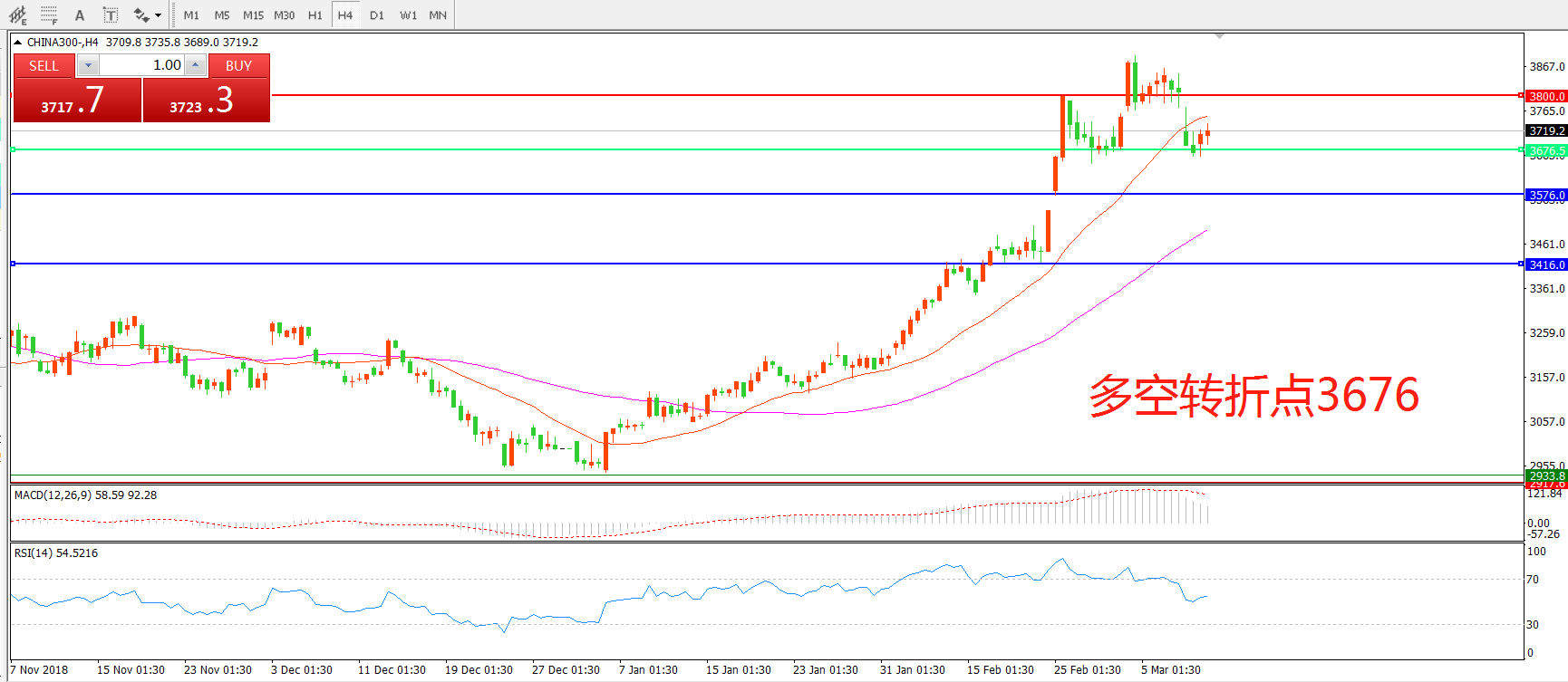 4小时图看,CHINA300中华指数高位出现回调,连续下行后企稳于前期密集成交区,形态上依然偏多,均线系统呈多头排列, MACD红柱缩减,RSI指标掉头,整体思路宽幅震荡。