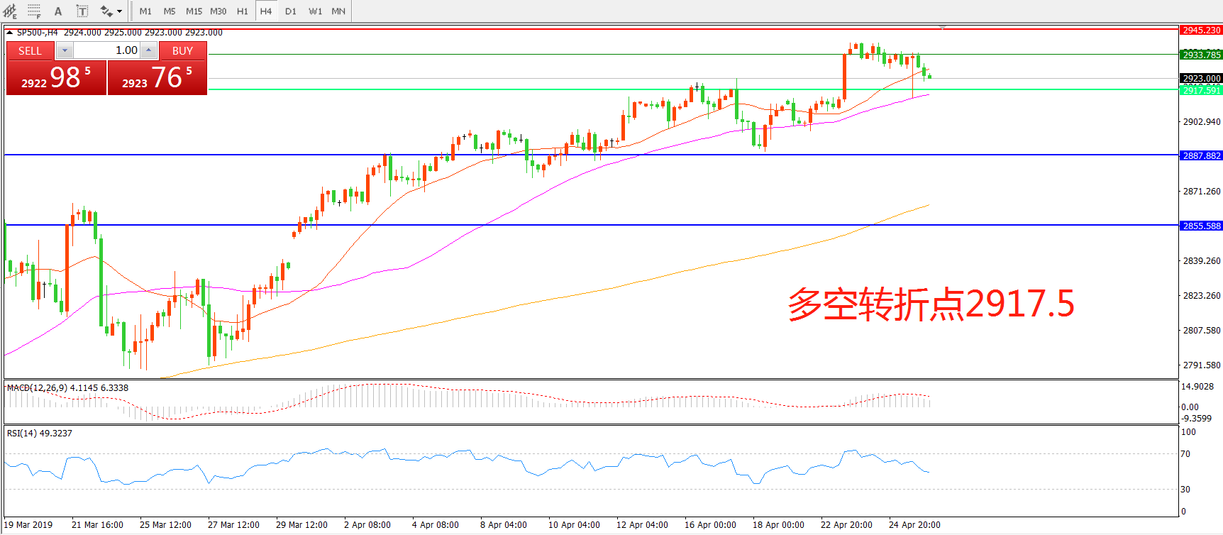 4小时图看,标普500冲高回落,跌破21周期均线, 均线系统仍呈多头排列,但MACD红柱缩短,RSI指标向下,日内有回调可能,重点关注2917一线支撑情况。