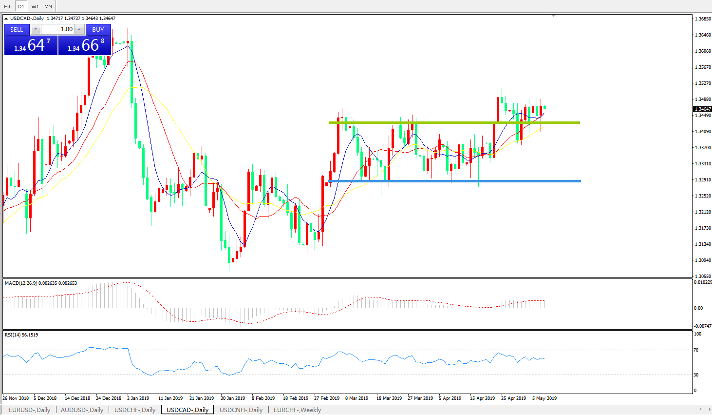 技术面简析:日线图均线有序多头排列,汇价连续多日宽幅整理后有上行迹象,MACD0轴上方运行且动能柱放量中,RSI震荡走平,预计汇价近期大概率将进一步走高。