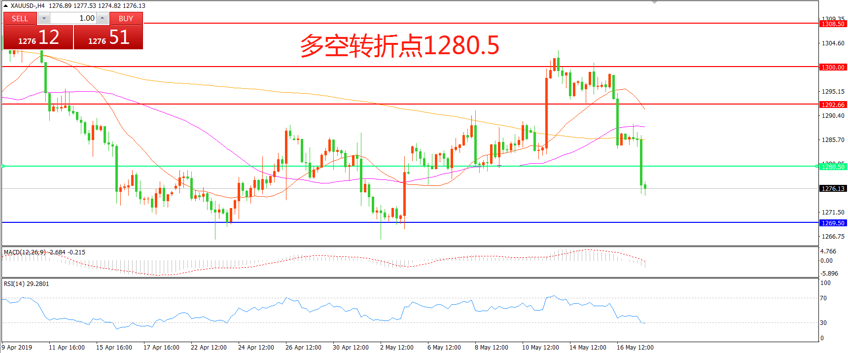 受中美贸易摩擦影响,金价上周初升破千三大关,刷新一个月新高。但随着避险情绪降温、经济数据提振美元走高、金价再度回落。截止收盘,现货黄金报1277.53美元/盎司,周跌幅0.66%,录得连续四个交易日收跌。金价在周五一度跌至1274.93美元,创两周新低。而本周少风险事件将相继出炉,投资者需高度关注。其中美联储公布4月货币政策会议纪要、欧洲央行4月货币政策会议纪要、以及欧洲议会换届选举都可能成为影响市场情绪的重大事件。