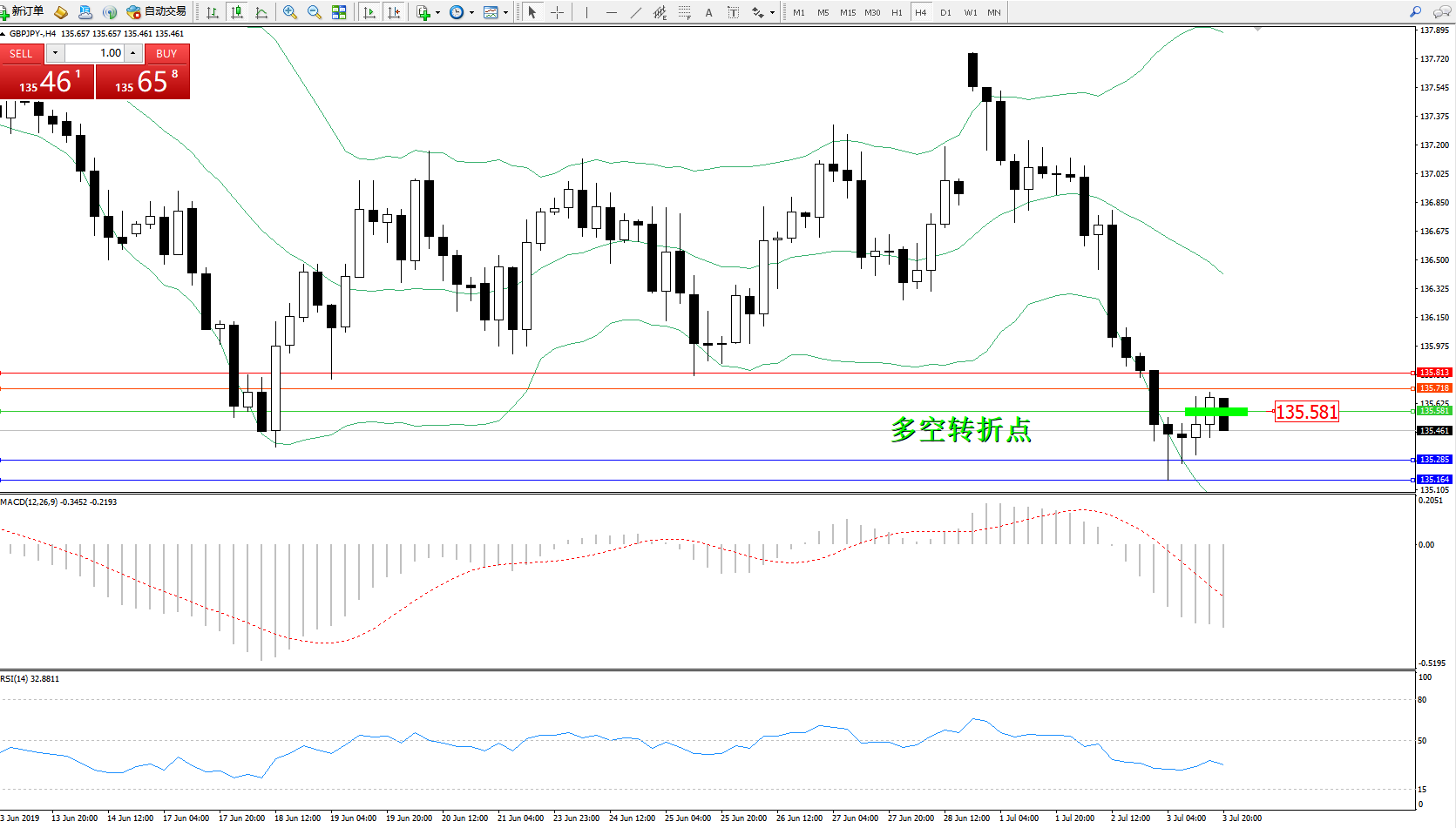 交易策略:135.581下方看跌,目标135.285、135.164