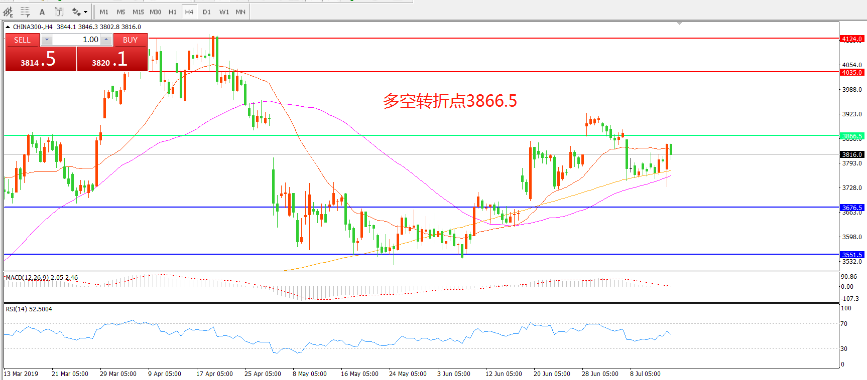 4小时图看,沪深300指数以200周期均线为支撑一度冲高,小幅回落后延续震荡,MACD红柱缩短,RSI指标走平,日内震荡概率较大。