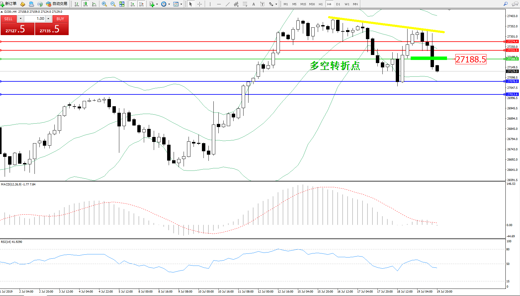 道琼斯指数7月19日(周五)收盘下跌68.80点,跌幅0.25%,报27154.20点。美国股市上周五延续了当周的跌势,一方面由于波斯湾紧张局势升级,另外投资者猜测美联储将会把降息幅度限制在25个基点。根据美联储官员近期的公开声明及采访来看,美联储因担忧全球经济增长放缓、贸易不确定性上升及通胀回落等问题,准备在即将召开的议息会议上降息25个基点,进一步降息亦成可能。目前综合各官员态度分析,美联储尚未准备采取更为大胆的行动,在7月会议上行降息50个基点的可能性较小。