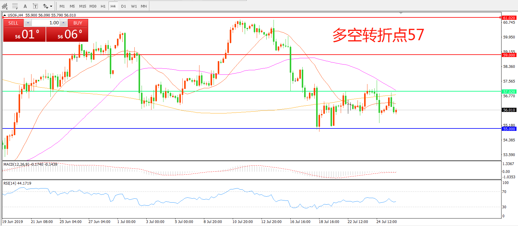 周四(7月24日)欧洲央行维持三大利率不变,但调整了前瞻指引,预计将保持现有关键利率水平不变或者更低水平至少至2020年上半年。欧洲央行声明称,在相当长的一段时期内,需要采取高度宽松的货币政策立场,因为无论是现实的还是预期的通胀率,都一直低于其目标水平。央行的宽松政策为油价提供了一定的支撑,但由于对经济增长放缓可能减少燃料需求的担忧挥之不去,美油昨日冲高回落,收报56.03美元/桶。
