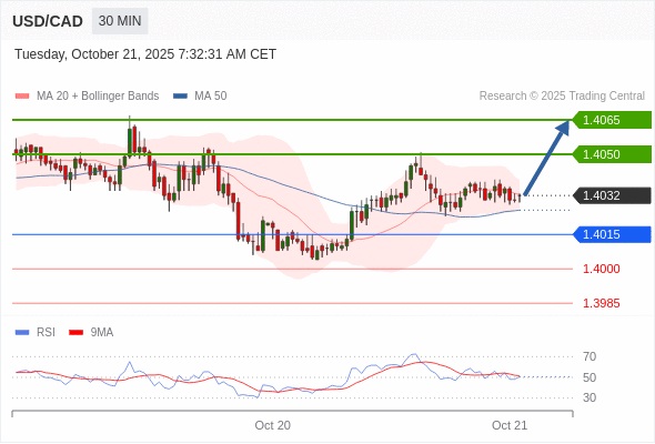 在 1.4015 之上,看涨,目标价位为 1.4050 ,然后为 1.4065 。