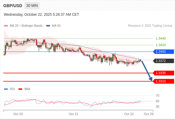 在 1.3400 之下,看跌,目标价位为 1.3335 ,然后为 1.3310 。