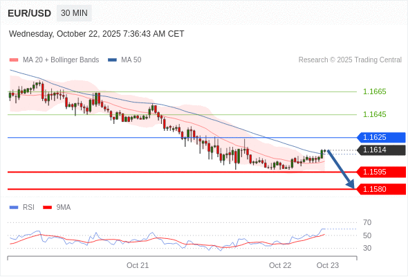 在 1.1625 之下,看跌,目标价位为 1.1595 ,然后为 1.1580 。