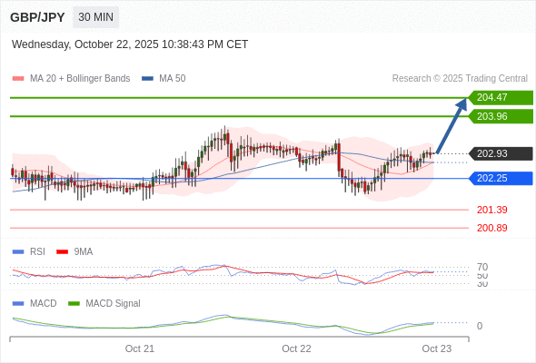 英镑/日元 当日内: 看涨,当 202.25 为支撑位。