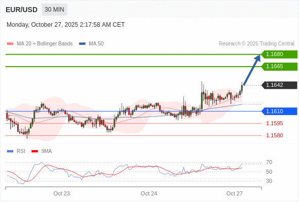 在 1.1610 之上,看涨,目标价位为 1.1665 ,然后为 1.1680 。