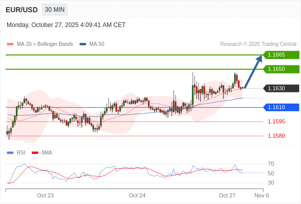 在 1.1610 之上,看涨,目标价位为 1.1665 ,然后为 1.1680 。