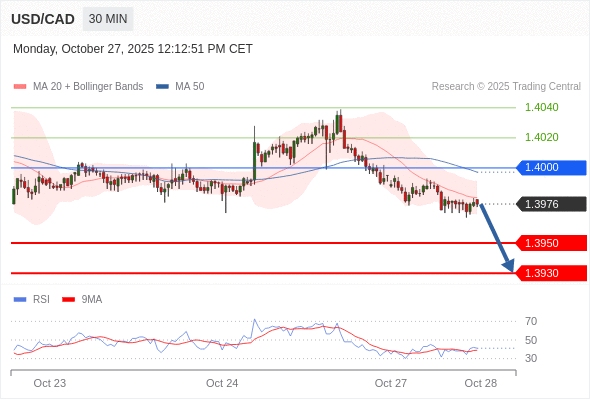 在 1.4000 之下,看跌,目标价位为 1.3950 ,然后为 1.3930 。