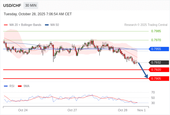 在 0.7955 之下,看跌,目标价位为 0.7920 ,然后为 0.7905 。