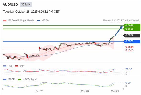 澳元/美元 当日内 : RSI是超买的