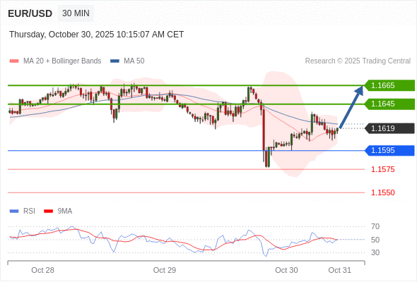 在 1.1595 之上,看涨,目标价位为 1.1645 ,然后为 1.1665 。