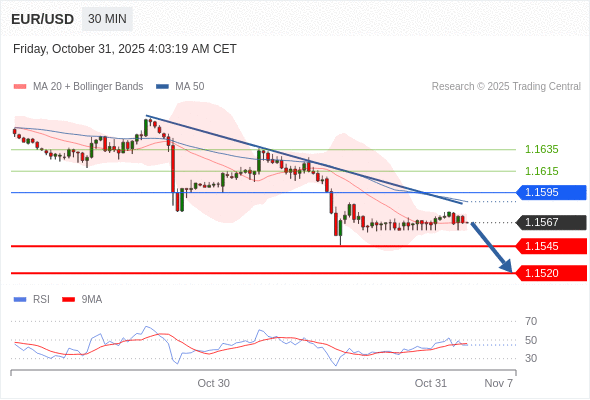 在 1.1595 之下,看跌,目标价位为 1.1545 ,然后为 1.1520 。