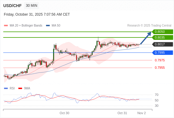 在 0.7995 之上,看涨,目标价位为 0.8035 ,然后为 0.8050 。