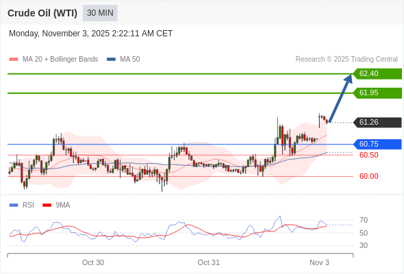 在 60.75 之上,看涨,目标价位为 61.95 ,然后为 62.40 。