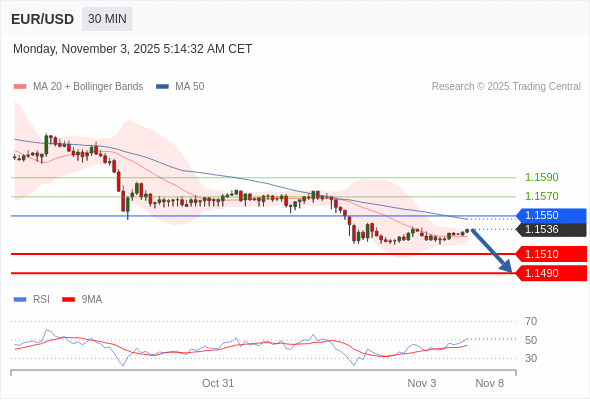 欧元/美元 当日内: 短期关键阻力位在1.1550。