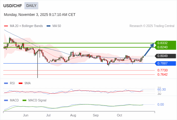 美元/瑞郎 短线 : 看涨,当 0.7887 为支撑位。