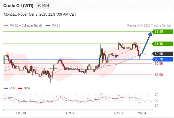 在 60.70 之上,看涨,目标价位为 61.40 ,然后为 61.95 。