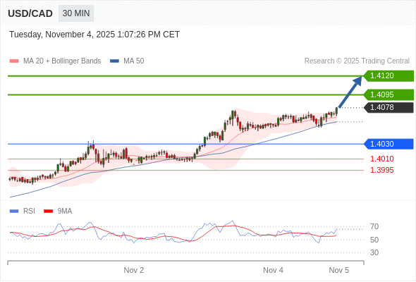在 1.4030 之上,看涨,目标价位为 1.4095 ,然后为 1.4120 。