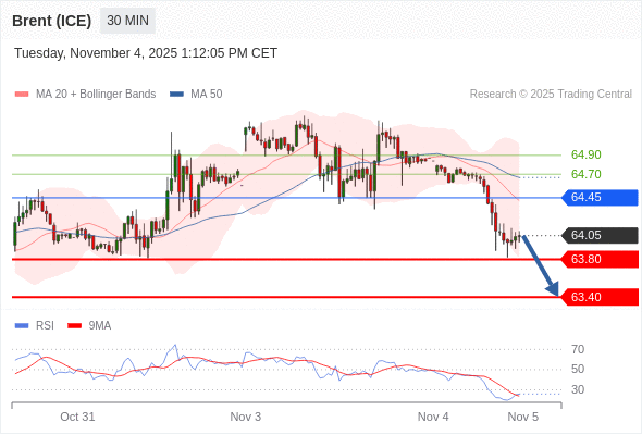 在 64.45 之下,看跌,目标价位为 63.80 ,然后为 63.40 。