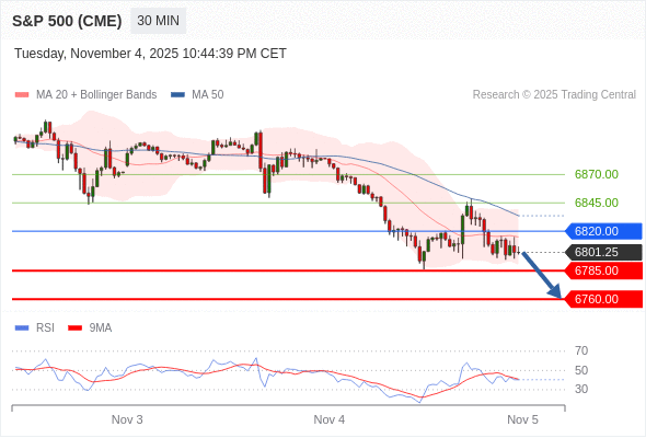 交易策略: 在 6820.00 之下,看跌,目标价位为 6785.00 ,然后为 6760.00 。