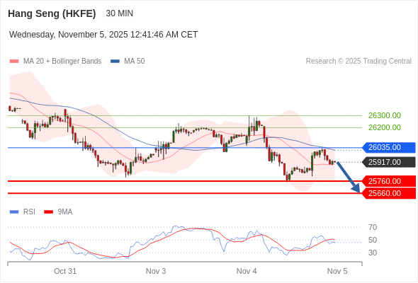 交易策略: 在 26035.00 之下,看跌,目标价位为 25760.00 ,然后为 25660.00 。