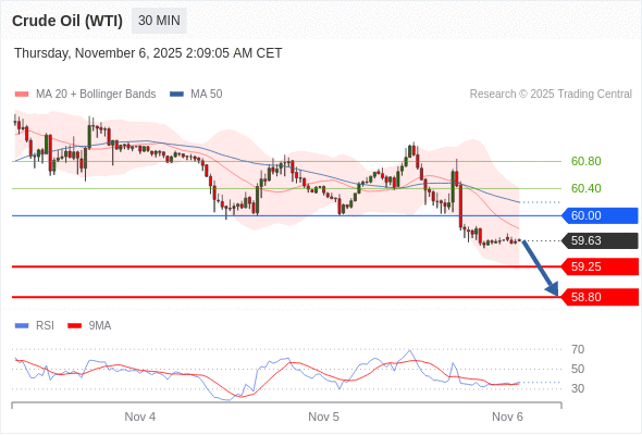 交易策略: 在 60.00 之下,看跌,目标价位为 59.25 ,然后为 58.80 。