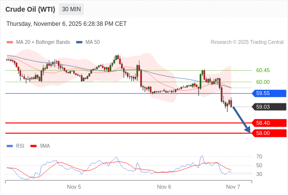 在 59.55 之下,看跌,目标价位为 58.40 ,然后为 58.00 。