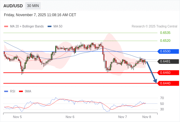 在 0.6500 之下,看跌,目标价位为 0.6460 ,然后为 0.6440 。
