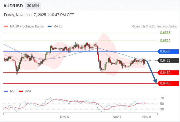 在 0.6500 之下,看跌,目标价位为 0.6460 ,然后为 0.6440 。