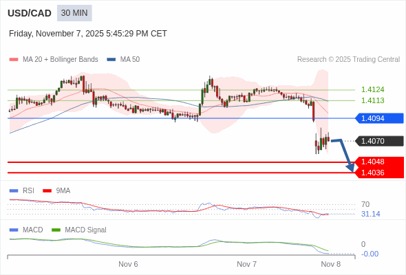 美元/加元 当日内 : 看跌,在 1.4094 之下。