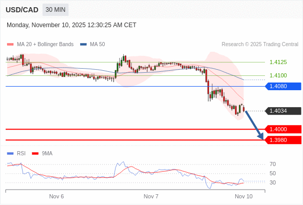 在 1.4080 之下,看跌,目标价位为 1.4000 ,然后为 1.3980 。