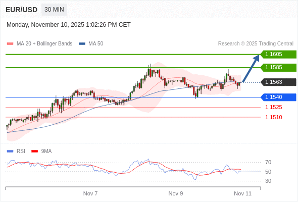 在 1.1530 之上,看涨,目标价位为 1.1585 ,然后为 1.1605 。
