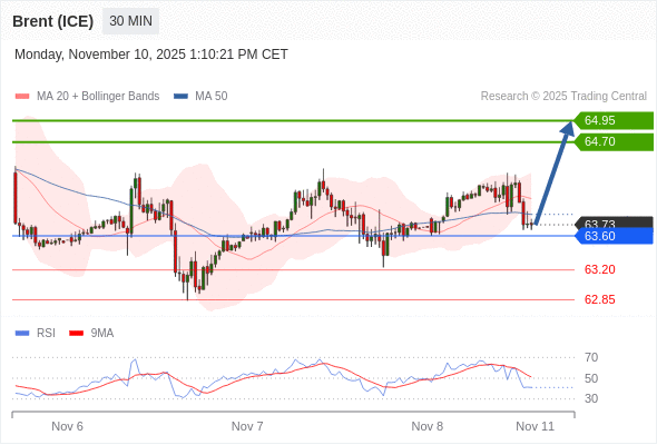 布伦特原油 (ICE) (F6) 当日内: 超短线(当日内)支撑位在63.60附近。