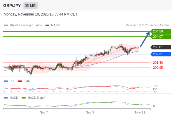 英镑/日元 当日内: 看涨,当 202.31 为支撑位。
