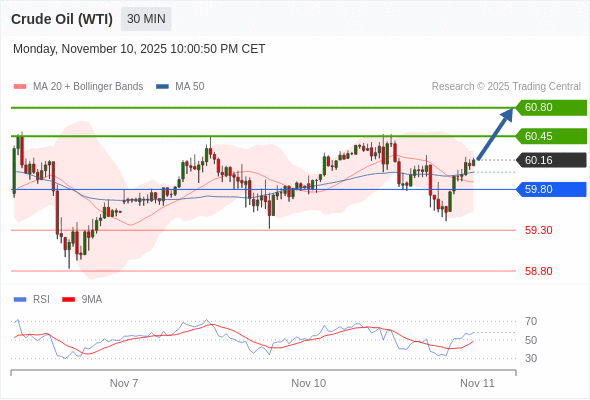 在 59.80 之上,看涨,目标价位为 60.45 ,然后为 60.80 。