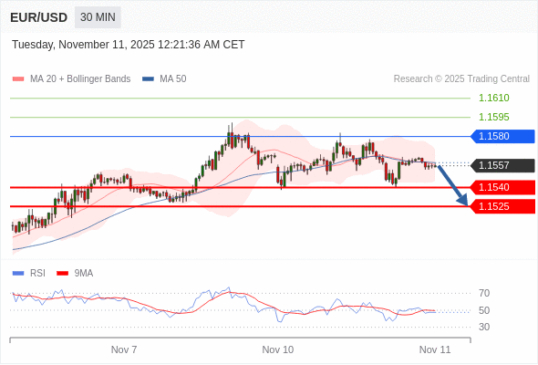 在 1.1580 之下,看跌,目标价位为 1.1540 ,然后为 1.1525 。
