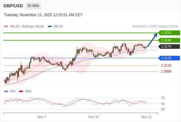 在 1.3135 之上,看涨,目标价位为 1.3195 ,然后为 1.3220 。
