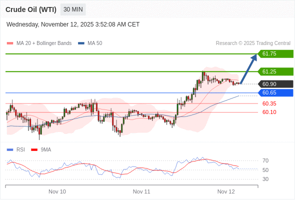 在 60.65 之上,看涨,目标价位为 61.25 ,然后为 61.75 。