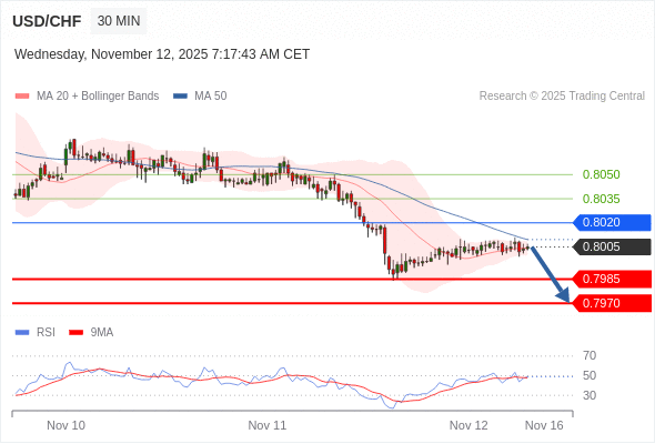 在 0.8020 之下,看跌,目标价位为 0.7985 ,然后为 0.7970 。