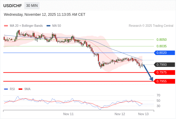 在 0.8020 之下,看跌,目标价位为 0.7975 ,然后为 0.7955 。