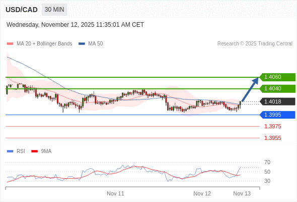 在 1.3995 之上,看涨,目标价位为 1.4040 ,然后为 1.4060 。
