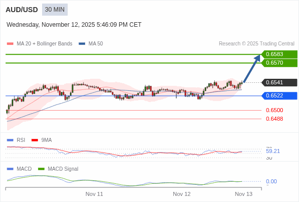 澳元/美元 当日内 : 看涨,当 0.6522 为支撑位。